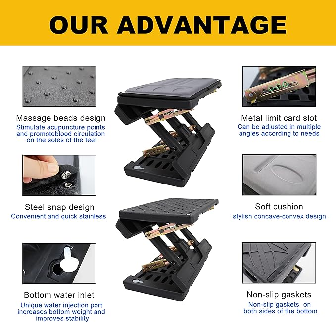 - [Special details]: Desk Foot Rest Ergonomic.There is a water injection port at the bottom of the product, (according to personal needs) when water is injected, it can increase the weight of the bottom and improve the stability of the product, the product can be folded into a mini size LxHxW 40×32×6cm/15.7"x12.6 "x2.36", lightweight at 5.9 lbs, easy to carry.
