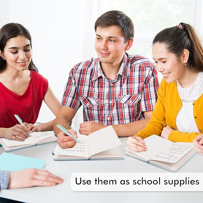 - Feela 5 Pack Classic Ruled Notebooks contains 5 sky blue ruled sturdy cover notebooks and 5 Black Retractable Pens. Each of the notebooks measures 8.3” x 5.1”, which is perfect to carry and easily held by young girls and boys. These black cute pens are customized to be placed in the pen holder, which is pretty convenient.