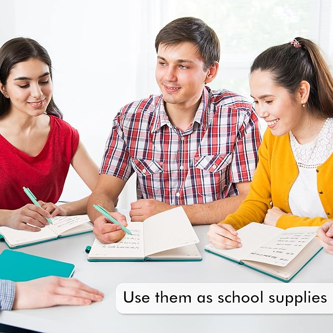 - Feela 8 Pack Classic Ruled Notebooks contains 8 emerald ruled sturdy cover notebooks and 8 Black Retractable Pens. Each of the notebooks measures 8.3” x 5.1”, which is perfect to carry and easily held by young girls and boys. These black cute pens are customized to be placed in the pen holder, which is pretty convenient.