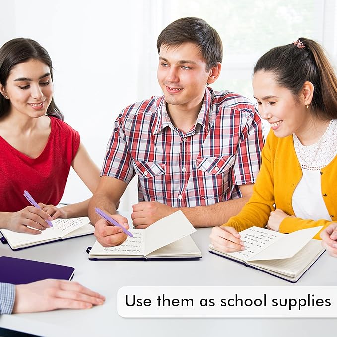 - Feela 3 Pack Classic Ruled Notebooks contains 3 purple ruled sturdy cover notebooks and 3 Black Retractable Pens. Each of the notebooks measures 8.3” x 5.1”, which is perfect to carry and easily held by young girls and boys. These black cute pens are customized to be placed in the pen holder, which is pretty convenient.