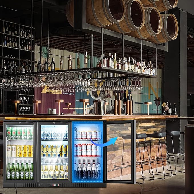 - COST-EFFECTIVE BAR REFRIGERATOR COOLING SOON-The built-in high-powered refrigeration system combines optimal air circulation with an efficient condenser fan motor,ensures that the beverage optimal temperature.Digital temperature display and controls make it convenient to monitor and adjust the temperature,always keep your customers happy with cool beers and drinks.This 3 glass door bar fridge with 4 adjustable feet bottom to support and avoiding leaking or dust.