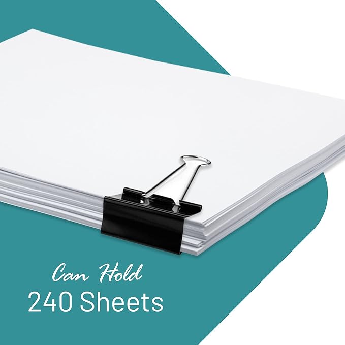 - Includes 144 large binder clips. 2” – holds 240 sheets of paper.