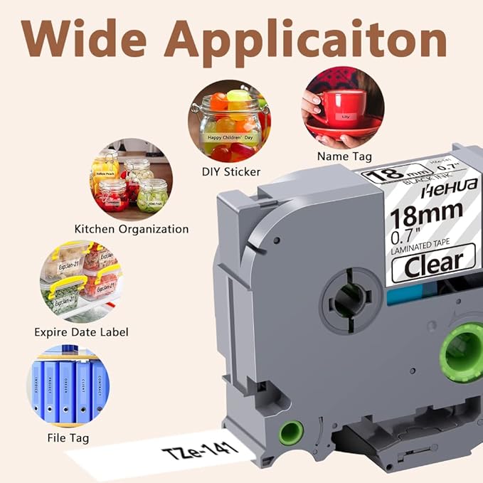 - Wide application: Compatible for Brother P-touch TZe 141 label tape is ideal to print clear, good-looking and durable labels. These labels are great for shelving, kitchen use, cabinets, file folders, USB sticks, food containers, storage boxes, personal possessions, children's school equipment with it's superior adhesive