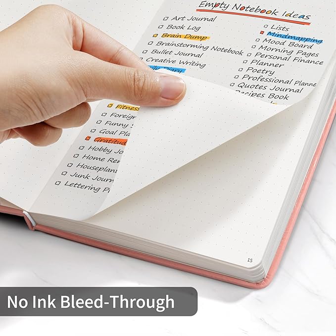 - Multifunctional Cover: The hard cover is made of vegan leather, and designed with a pen loop, an elastic band, two ribbon page markers, an expandable inner pocket.