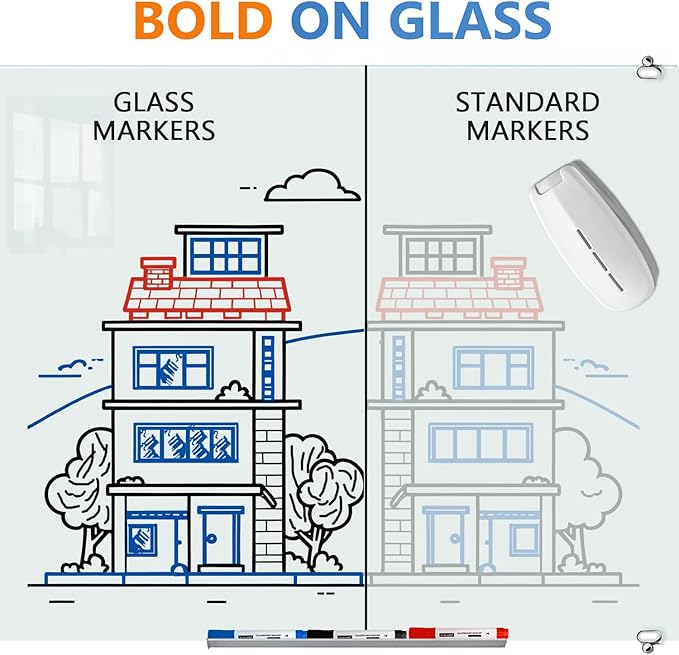 - 【PREMIUM ERASER & MARKERS】- Non-toxic, low-odor. Erase with less effort, simply glide This eraser over a dry-erase board with no vigorous scrubbing. The dual material of foam and felt smoothly picks up ink and dust. Premium glass dry-erase markers are optimized for use on glass boards. Markers delivers strong bold color every time, to ensure that your message is distinct and legible.
