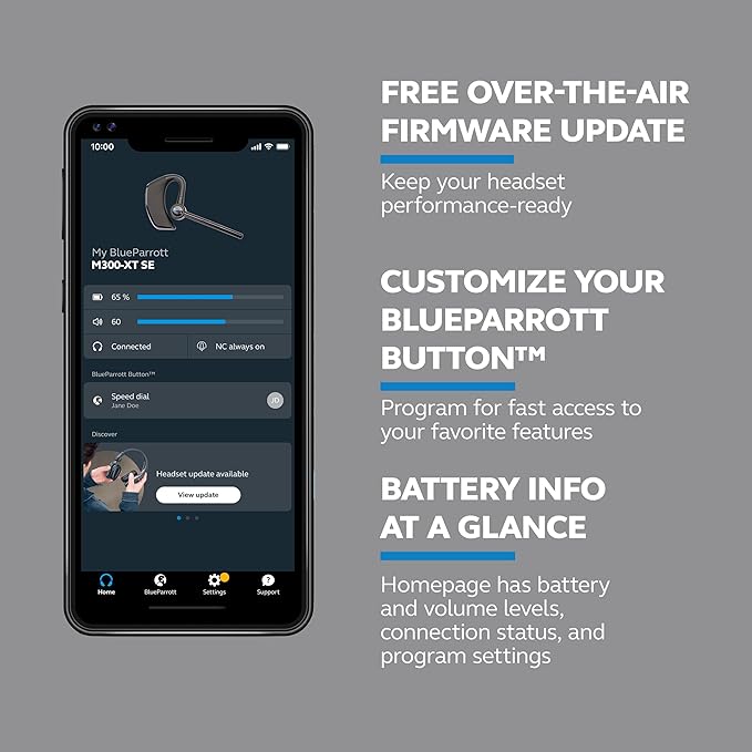 - Extended Connection Headset: Featuring 14 hours of talk time and a 300 ft. range, this headset for driving includes a customizable BlueParrott Button for instant access to frequently used functions