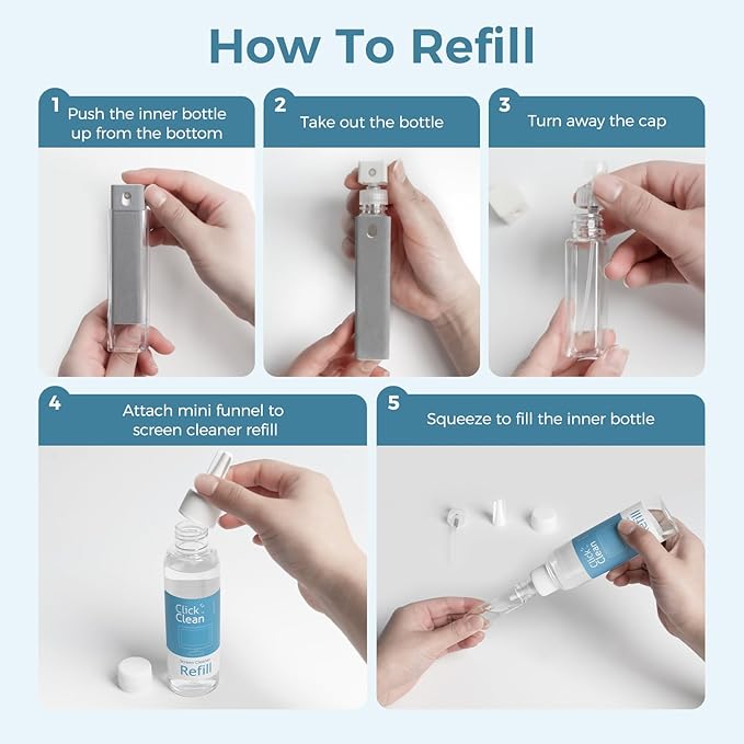 - ALL-IN-ONE MULTIFUNCTIONAL CLEANER KIT- In addition to the 4 screen cleaners included, you get one 4oz bottle of refill, 1 microfiber cloth, 1 mini funnel (built-in), and a sprayer. The refill extends the product's life; the mini funnel helps you refill the cleaner; the sprayer mounts to the refill spout, and the fibre cloth is a new product.