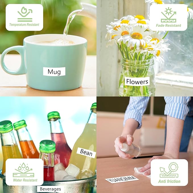 - 24mm label tape features: water resistant, fade resistant, temperature resistant, corrosion resistant, abrasion resistant, grease resistant, grime resistant and chemical resistant