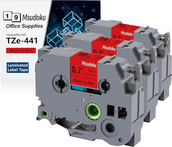 - These compatible for brother label maker tape 18mm 0.7 TZe-441 TZe441 have strong adhesive and no sticky residue when you remove it. The split back design of ptouch label tape 18mm red tape is very easy to peel off