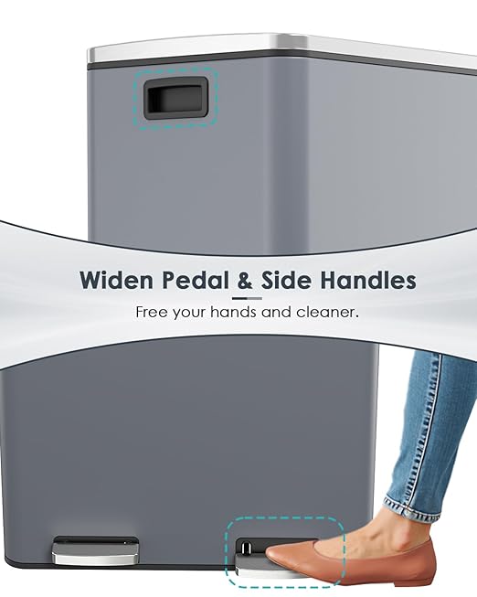 - THICK & WIDE PEDEL: Wide and thick stainless steel pedal is ergonomically designed, so you can throw out trash without bending over, and you don't need to touch the lid of the bucket when throwing out trash.