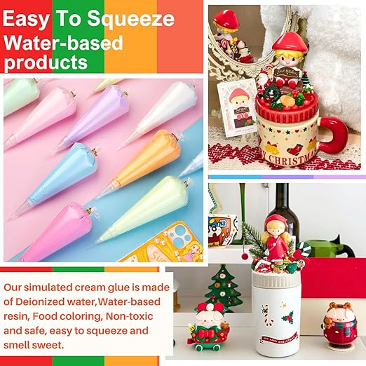 - 【High-Quality Ingredients】Our Decoden Cream glue is made of Deionized water, Emulsifier, Water-based resin, Food coloring. Non-toxic and safe, easy to squeeze and smell sweet. Perfect for DIY phone case, Cupcakes, cake, candy, earphone case, photo frame, and any handmade products