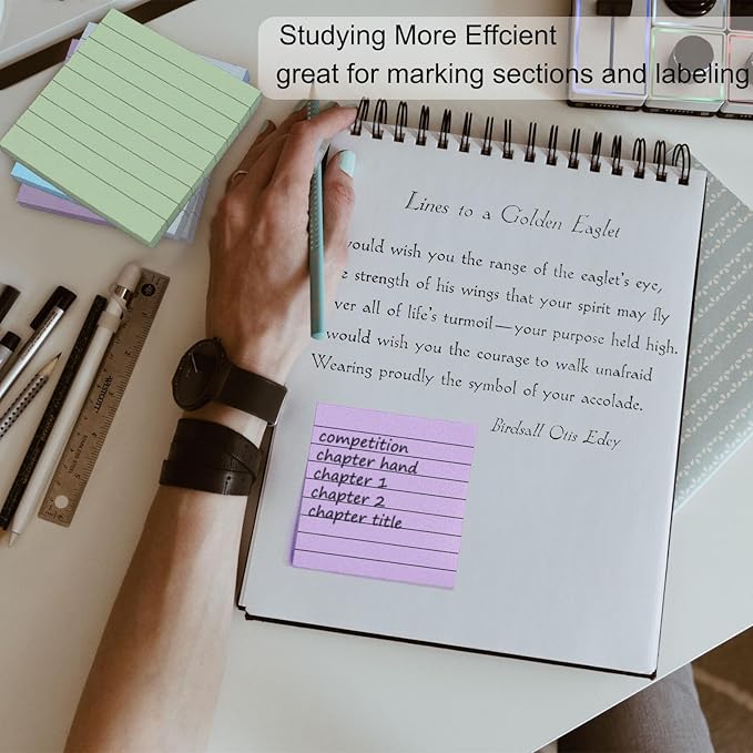 - MATERIAL: lined sticky notes are made of thick paper, which will not easily break, quality adhesive and quality paper ensure sheets stay on any surface without curling, not easily to fall off, and removes cleanly as well.