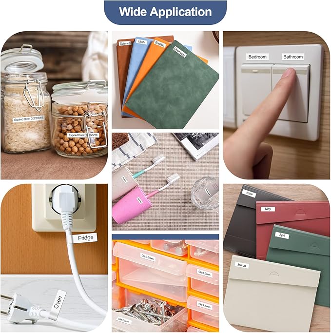 - You could print all the text you need together on one long label tape, then cut them into individual labels. You can use the tz tape 12mm 0.47 laminated white label your cabinets, storage boxes, files, kitchen items