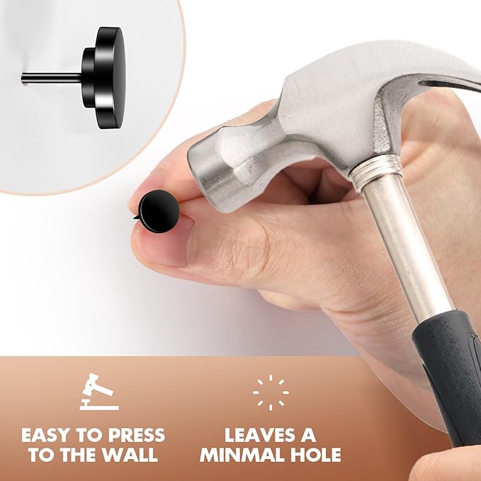- 【Easy Installation】In the shape of ordinary push pins with black color, these metal push pins are easy to install without causing damage to your walls. Simply tap them in with minimal effort using a picture hanging tool, and you're ready to showcase your favorite wall art or decorations, these metal push pins and picture hanging hooks are perfect for heavy-duty use.