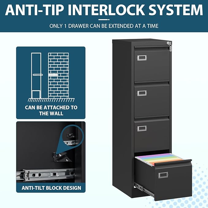 - 【File Cabinets with Lock】The top lock can secure all four drawers and protect your important paperwork, documents and books safe. To improve safe, this interlock system is also equipped with anti-tip mechanism, which is installed on each drawer side.
