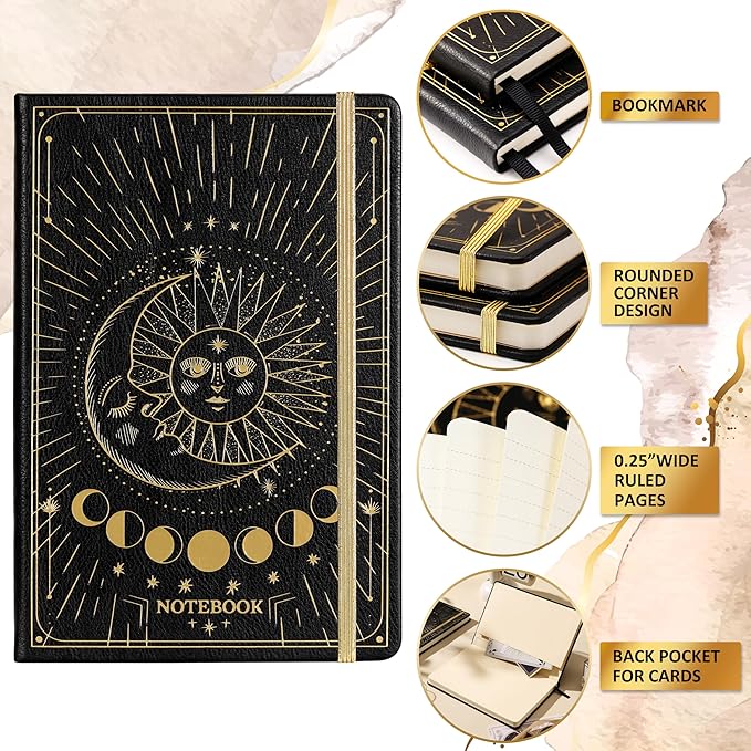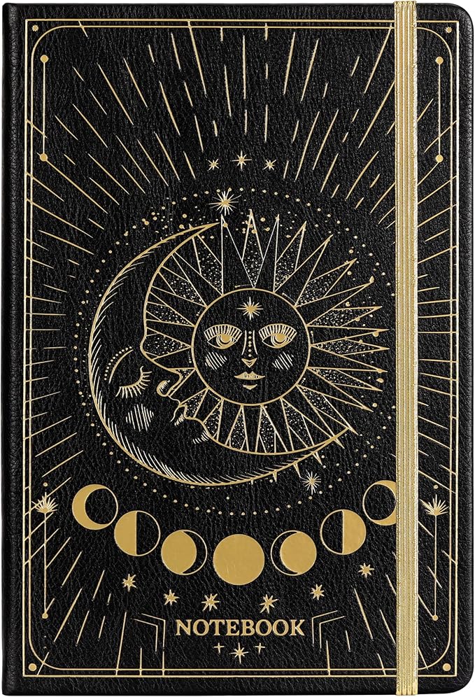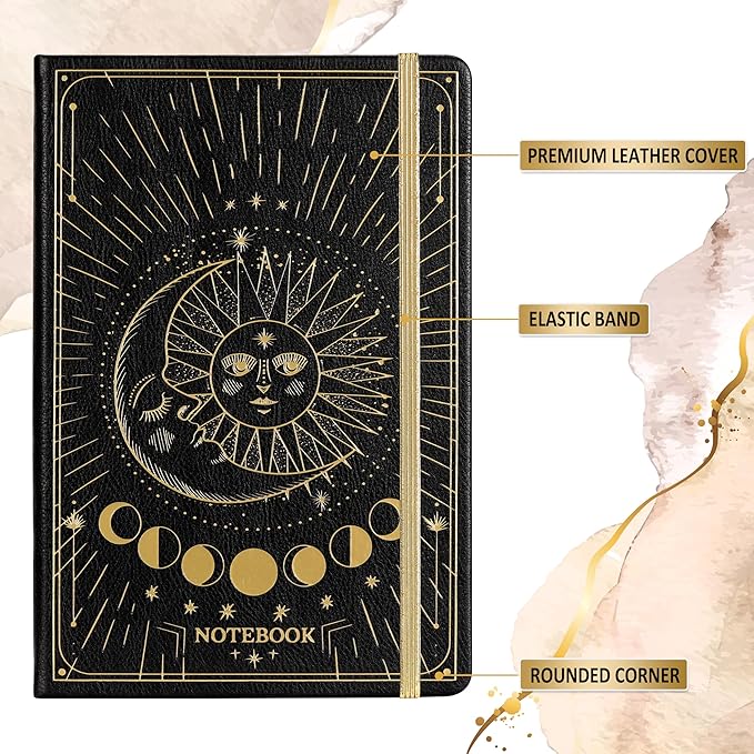 Artfan Ruled Notebook/Journal β Premium Thick Paper Faux Leather Classic Writing Notebook with Pocket + Page Dividers Gifts, Banded, Large, 144 Pages, Hard Cover, Lined (5.8 x 8.4) - Sun and Moon