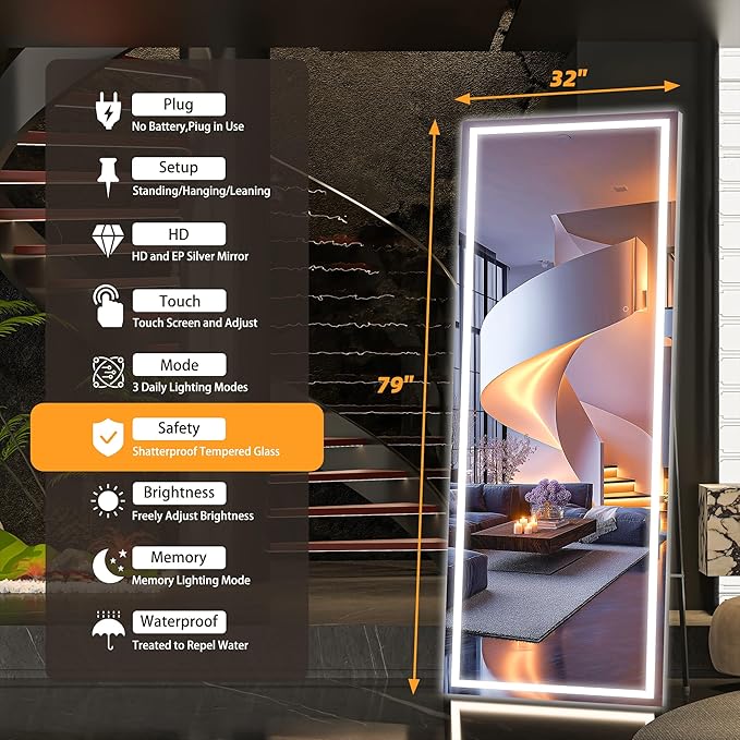 - 【Upgraded Tempered Glass】: Unlike other mirrors, the HASIPU LED floor mirror is designed with 5MM tempered glass. When damaged by external force, it forms small blunt particles in a honeycomb-like pattern, reduces the risk of serious injuries to humans. Additionally, tempered glass has a 5 times higher impact and bending strength compared to regular glass. Moreover, tempered glass also exhibits excellent thermal stability, capable of withstanding temperature changes up to 300℃.