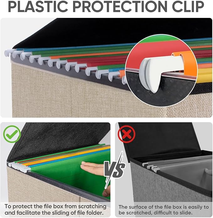 - [UNIVERSAL SIZE] Our file box with lid fits letter-sized files. It is designed for efficiency and functionality, with its smooth PVC slide rails on both sides, you can effortlessly slide file folders for easy access and neatly arranged. The lid fits snugly on the box after hanging folders. (NOTE: file folders are not included)