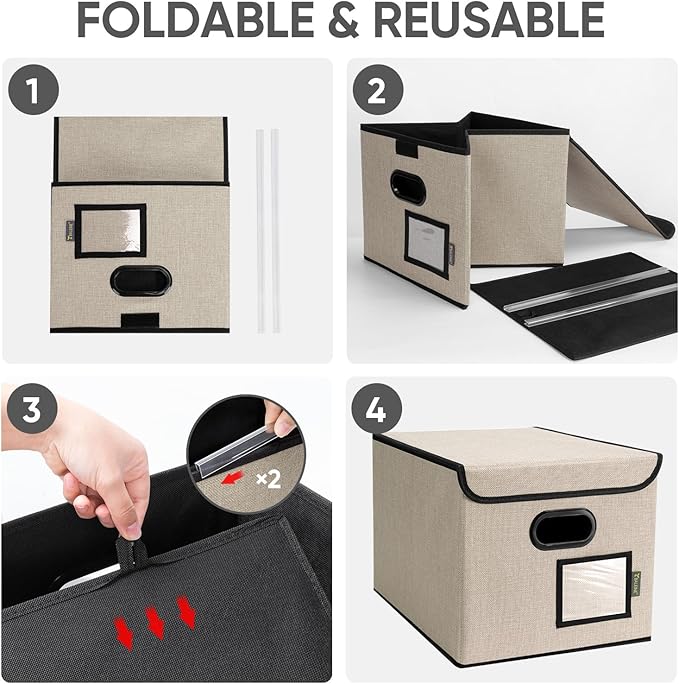- [OPTIMIZED DESIGN] Designed with convenience in mind, our file storage box helps to elevate your efficiency and organization. The transparent label slot allows for quick identification of the contents stored inside the box. The collapsible design and sturdy handles ensure effortless storage and movement, making it convenient and easy to use.
