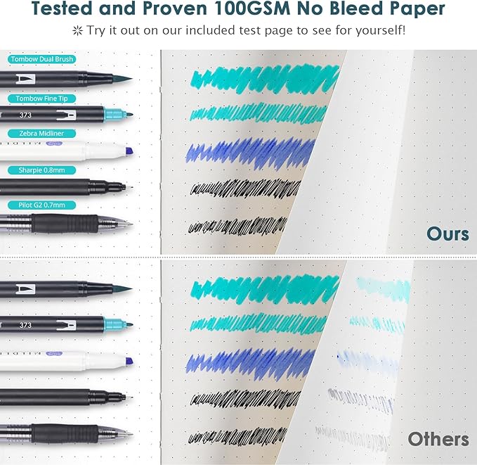 - 【Thick Paper for Writing Without Limits】Large A5 hardcover notebook (5.75"x 8.38"/146mm x 213mm), total 320 pages, includes 312 numbered pages(156 sheets). Each page includes 1107 dots with 5mm spacing: X27*Y41. Our INNOVATIVE PAPER TECHNOLOGY on 100GSM thick paper ensures a perfect canvas for your ideas - no bleed, no ghosting, as confirmed by tests with various pens commonly used in bullet journaling.
