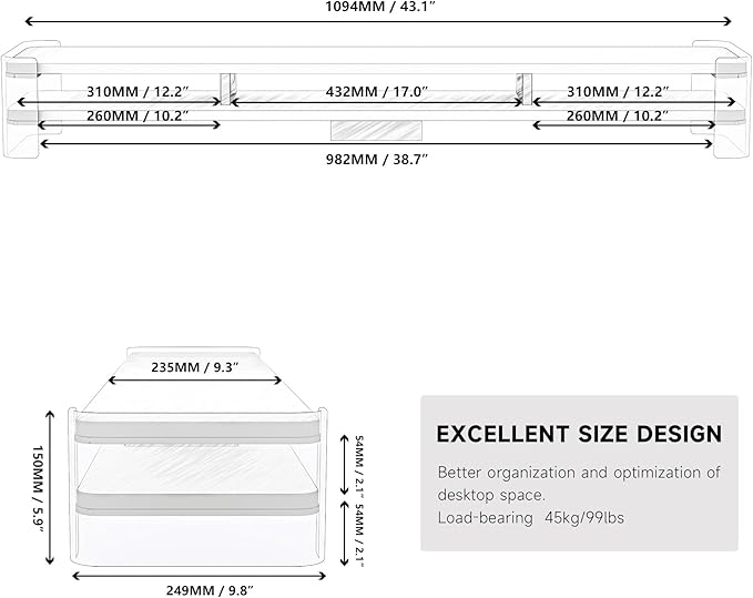 - 【Sturdy & Stable】: Monitor riser is 43.1 x 9.3 x 5.9 inches, with a board thickness of 0.59inches/15mm. The leg is made of 0.31inches/8mm high-quality acrylic material, the maximum load capacity is 45kg/99lbs, can easily handle either laptops or heavy monitors.