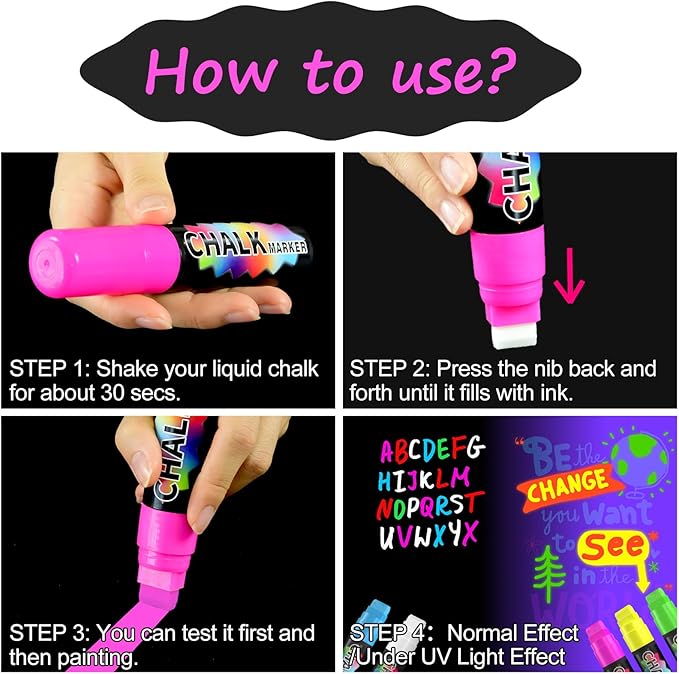 - 3 Vivid Colors: Fluorescent colors that only glow under UV or neon lights. Liquid chalk uses newly upgraded inks with more vibrant colors. Add style and get creative for Halloween, Christmas, holiday parties and more.
