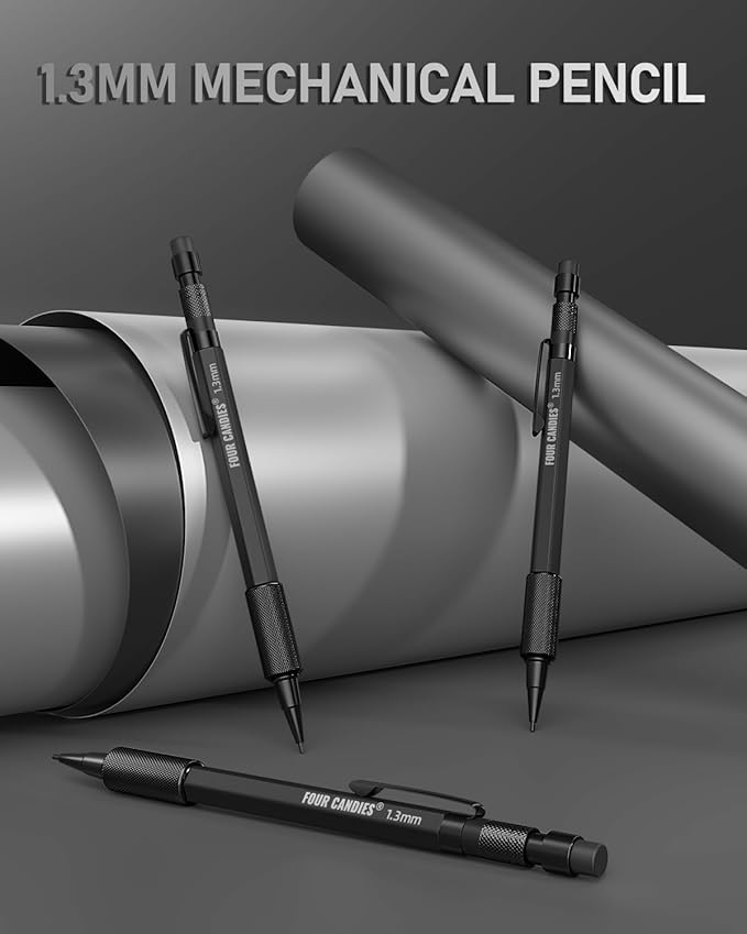 Four Candies 1.3mm Mechanical Pencil Set with 72 Lead Refill, 3PCS Metal Weatherproof Body Heavy Duty Carpenter Pencil, 3 Eraser, 16 Eraser Refill, for Outdoor Woodworking Drafting Marking with Case