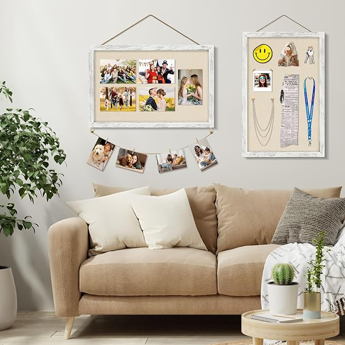 - Complete accessories: The 16x11 pin board comes with three triangular metal hooks, allowing you to hang the frame horizontally or vertically on shelves and walls. 20 wooden pins, 8 wooden clips, 4 gold hook nails, 3 screws, and 4 hemp ropes, providing you with a range of personalized decoration combinations.