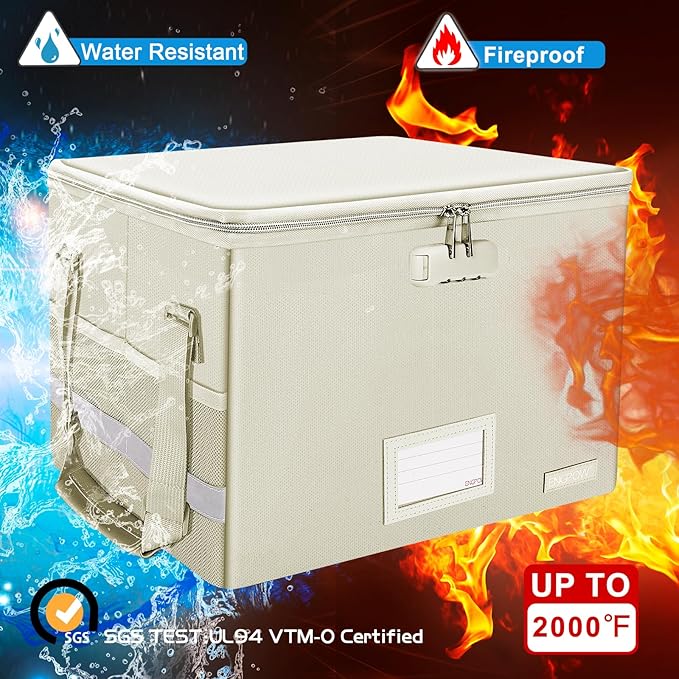 - Fireproof and water-resistant: Fireproof lock box is made of double layered non-itchy silicone coated fiberglass which stands up the temperature up to 2000β.It has been passed by SGS TEST(UL94 VTM-0 Certified).Fireproof file box is not only fireproof but also high water resistant in case it gets wet for any reason.Nothing is completely foolproof, but added protection is always a good idea.