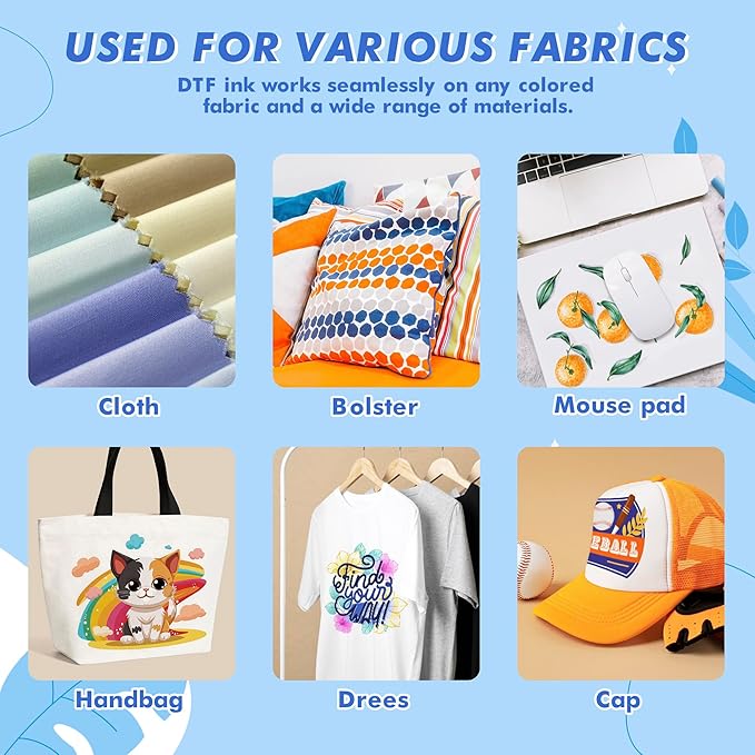 - 【Compatible with printers】Open the world of DTF printing with our inks.Work with Printers, A3 DTF printers, and wide format DTF printers. Head L1800, L805, R1390, 4720, I3200, XP600, DX7, DX5, 5113, 1430, TX800,P400, P408, P640, P600, P608, P800, P5000, P6000,R1800, R1900, R2000, R2400, 4800, 4880, 4900, 7880, 7890, R3000, R3880, F2000, F2100, F2200, P700, P900, XP-15000 and more