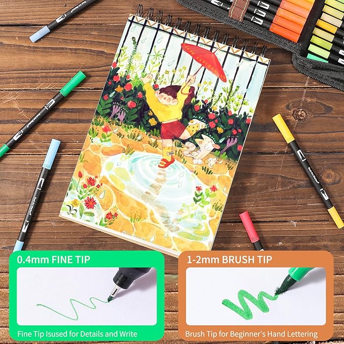 - Double-tip MARKER DESIGN:Double-tip Brush Pen allows you easily switch between creating crisp details and laying down thick, thin, or varied lines in one stroke. 0.4mm fine tip is great for sketching, outlining, and details, works well for intricate coloring books, writing, and doodling; 1-2mm soft brush tip for shading, coloring, quickly coloring in large areas art projects, hand lettering, and calligraphy beginners.