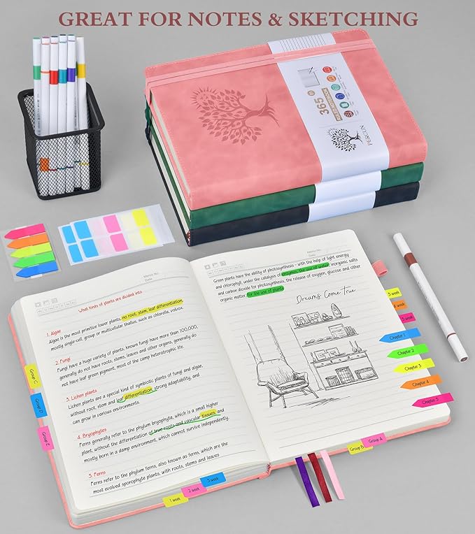 - 【180°Lay Flat for Writing】Our notebook also comes with 180°Lay Flat Journal Notebook, which makes writing a breeze. The elastic pen holder and bookmark ensure that you never lose track of your pen, and the 2 elastic closures ensure that your journal stays securely closed. The 3 colored ribbon bookmarks and 3 sticky labels provide even more ways to customize your journal to your liking.Built-in back pocket that is great for storing loose notes, cards, or other important items.