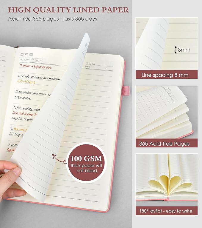 - 【365 Pages Premium Thick Paper】: Our PERCUN lined journal notebook is made of 365 pages high-quality 100Gsm thick ruled pager with an acid-free light Ivory paper that is thicker than normal. This premium quality paper will not cause bleeding, ghosting or smudging and is suitable for most types of pens,provides ample space for journaling, note-taking, and creative writing. The line spacing is 7mm, making it easy to write legibly and neatly.