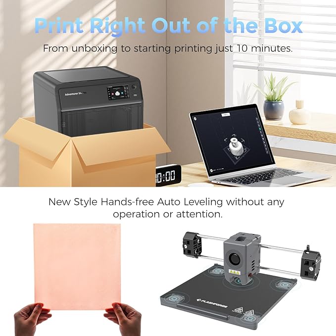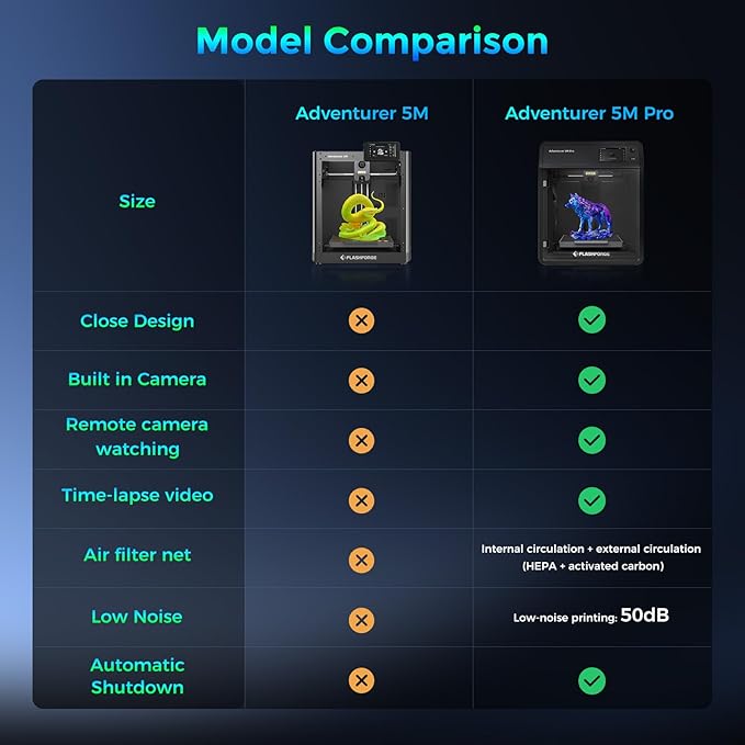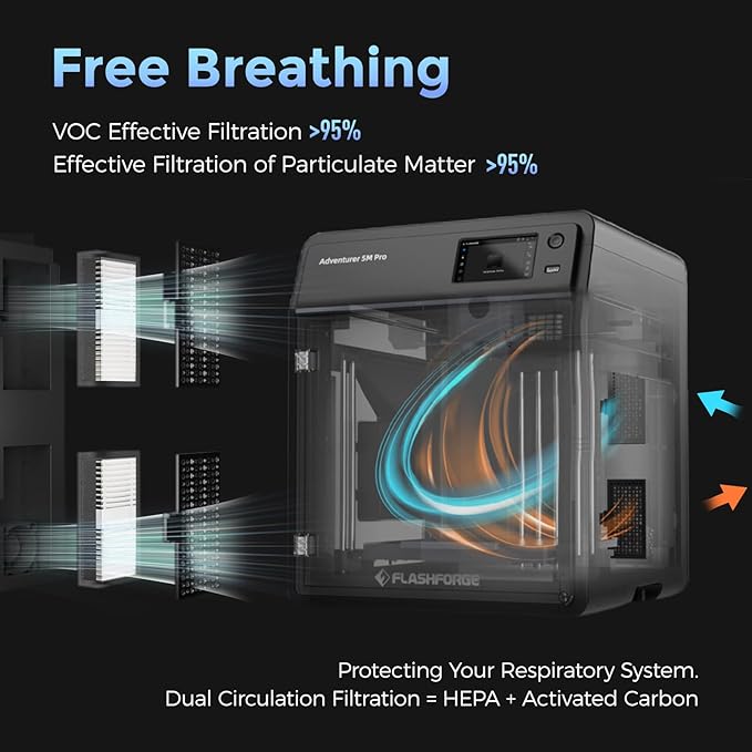 - Experience Smart Convenience:No manual leveling, Adventurer 5M PRO 3D printer just need one-click printing, without complicated operation procedures. Filament runout sensor and filament tangle detection, ensuring each successful prints. Fully Enclosed 3D printer AD5MPRO equipped with a dual filtration system of internal and external, suitable for use in closed environments, effectively blocking 99% of particles and VOCs, thus protecting your respiratory system