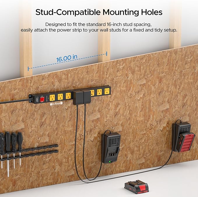 - [Humanized Design] This long power strip is designed to fit the standard 16-inch stud spacing, allowing you to easily attach it to your wall studs for a secure and organized setup. Wide-spaced 1.7-inch center-to-center outlet, perfect for bulky plugs and power supplies. 45° angled flat plug, and mounting supported hanging slots, all these features bring you more convenience