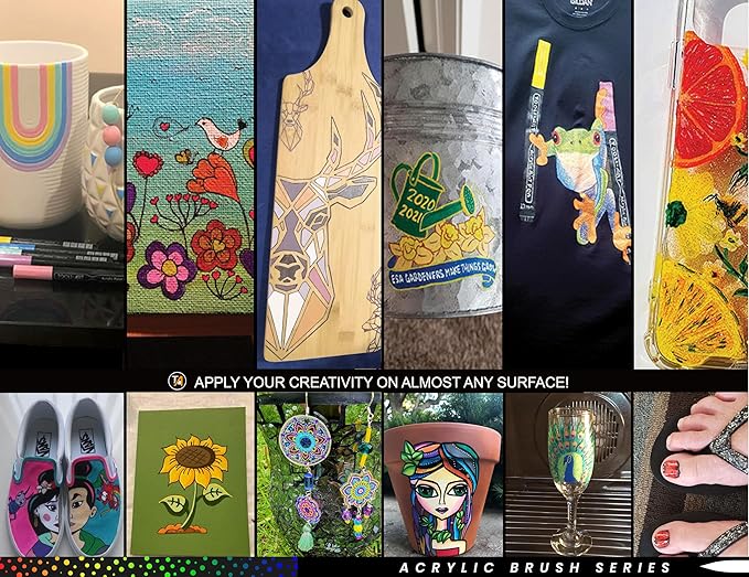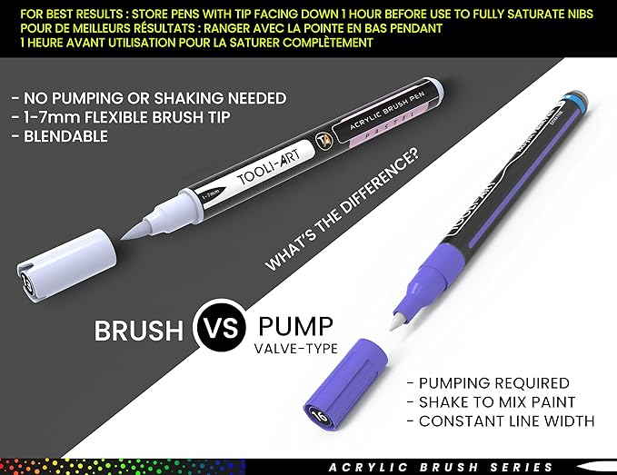 - ✔️FLEXIBLE BRUSH TIP – The pens are ready to paint without having to shake and prime the tips like traditional paint pens. The flexible brush tip makes color blending easier and can vary from a thin 1mm up to a bold 7mm line width, depending on the pressure applied. Paint pens are great for avoiding the mess that typically comes with cleaning brushes and pouring paint and are easy to travel with.