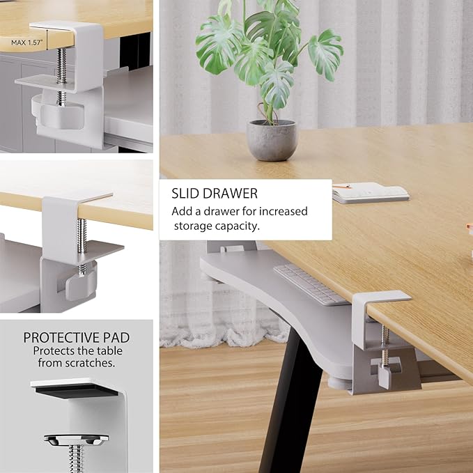 - [Ergonomic Benefits] - The desk clip keyboard tray is designed to elevate the keyboard and mouse to a more ergonomic height, reducing stress on shoulder and neck muscles; eliminating potential stress on the wrists; encouraging proper posture and allowing proper viewing distance.