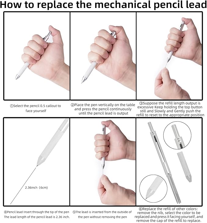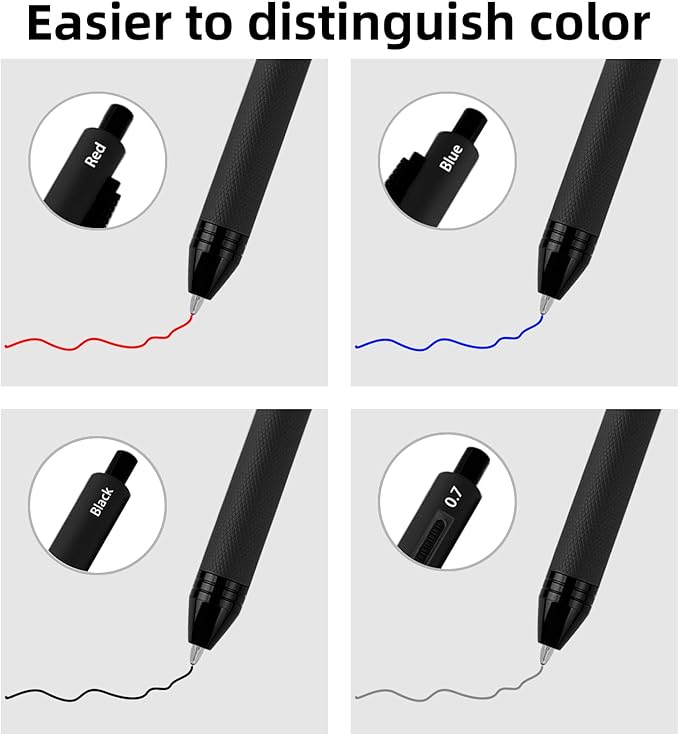 - Instructions for use:First, you need to select the color you want to write, then turn the case of the pen is marked with the side of that color you need in the direction of the other four fingers except the thumb in the state of holding the pen, tilting the barrel back 45° to hold the pen, then press down to press the refill of the color you want, if you want to retract the color refill, just press the black button on the clip.