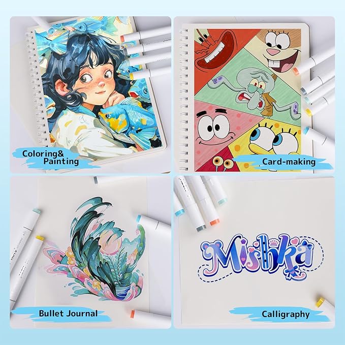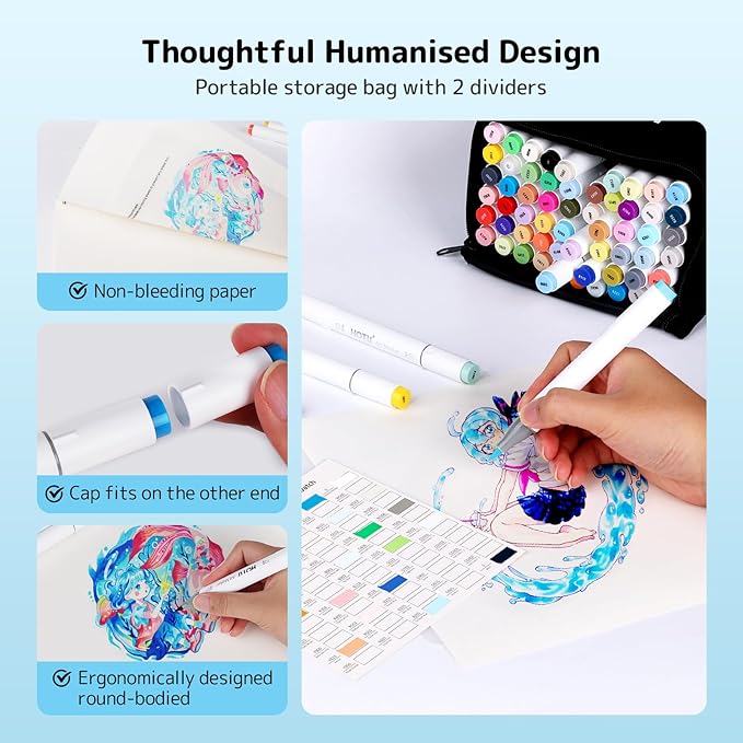 - 🎨THOUGHTFUL DETAILS & COMFORTABLE EXPERIENCE - Ergonomically designed for a soft and comfortable grip, the alcohol markers brush tip are reversible, ensuring durability. Art markers with an anti-bleeding pad safeguards your work, while the exchange pen cap adds to the overall convenience. All these thoughtful designs are here to enhance your painting experience.