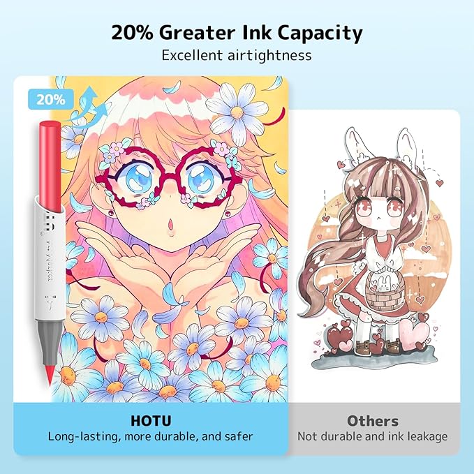 - 🎨SEAMLESS COLOR BLENDING - Alcohol markers with HOTU's high-quality ink, uniform ink flow ensures seamless color blending, eliminating grains and stripes. Markers boasting a massive 3.8G ink capacity for extended use, the alcohol-based ink dries quickly, paired with an anti-bleeding pad to ensure a clean and perfect finish.