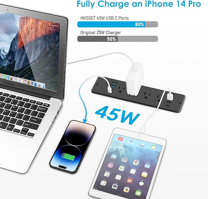 - 45W Fast Charging Power Strip: 8 Outlets Output rating 10 Amp / 125 Volt / 1250W. Come with fast charging QC 3.0 36W Max USB-A port and PD 3.0 45W Max USB-C port. different phones, iPads, laptops, and many many other things and this has every single plug in one strip, USB, usb c, and standard plug. So there is good future-proofing.