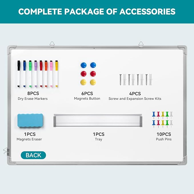 - 【Complete Accessory Set】-Get everything you need in one package! This white board calendar includes 8 vibrant dry erase markers, 1 easy-to-use eraser, 6 strong magnets, 1 convenient marker tray, 4 sets of expansion screws for secure mounting, and 10 push pins for the cork strip. This comprehensive accessory kit ensures you’re ready to start using your white board calendar dry erase right out of the box.
