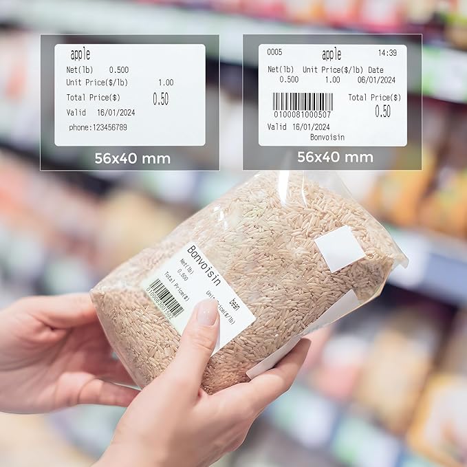 - As for its size, the actual label size is 60 X 40 mm. But we'd recommend to set the label size on computer program as 56 x 40 mm (default setting of our bonvoisin barcode scale) or 58 x 40mm. So there will be some space around the label, which will display more clearly and not print outside the border.
