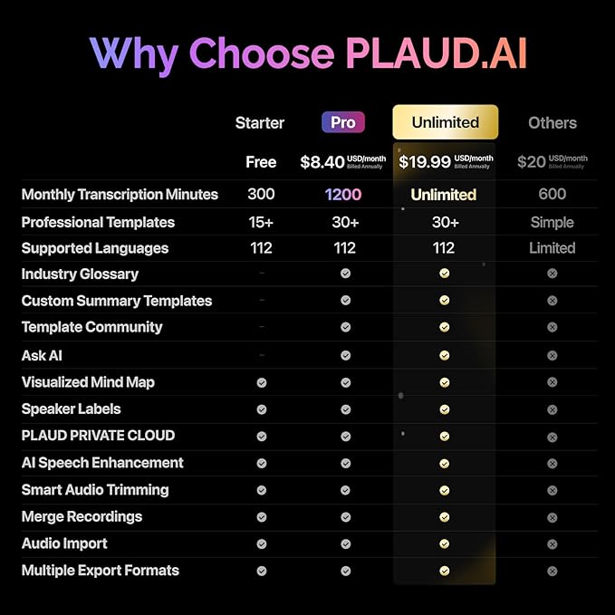 - NOTE: Once you activate your PLAUD NOTE, you will get a free Starter Plan, which includes 300 transcription minutes per month. If you need more minutes, you can subscribe to the Pro Plan or purchase more transcription time. The Pro Plan is $8.33/month ($99/year, $17.99/single Month), which includes 1200-minute monthly AI transcription & summary time and more professional summary templates.