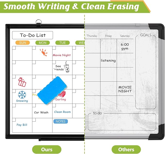- 【Smooth Writing & Durable】: The surface of large dry erase calendar for wall is made of high-molecular-density material, writing fluently, easier to wipe and more resistant to stains. High-grade sturdy aluminum frame with ABS plastic corners, with no sharp or pointed edges, using as student learning supplies is very safe