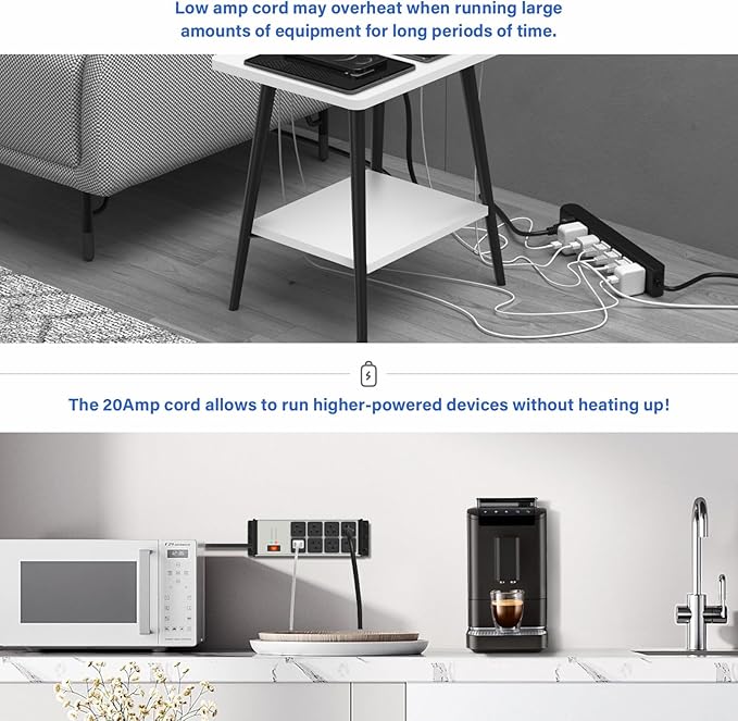 - 12 gauge 10ft heavy cord, rating: AC 20A 125V 2500w. If you are running a lot of equipment for long periods of time or fully loaded 15A equipment, and without overheating.