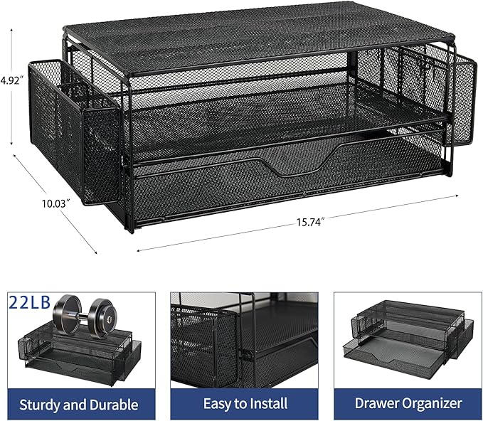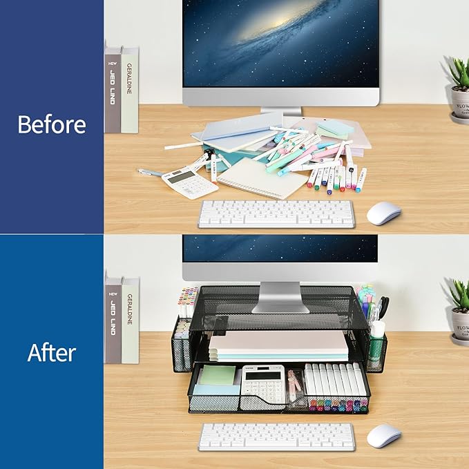 - Space Saving: Our dual-tier desktop organizer with drawer and 2 pen holders stores office supplies and office desk accessories neatly. As a purpose monitor riser, it keeps your workspace organized, helping you focus and work efficiently