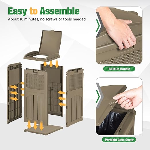 - Easy to Install Trash Bags: The waste bin for outdoors is compatible with 30-33 gallon trash bags. You need to lift the trash bag holder, put on the trash bag, put down the holder, and then finish the installation. After opening the inner lid, the garbage bag can be stably fixed in the card slot.