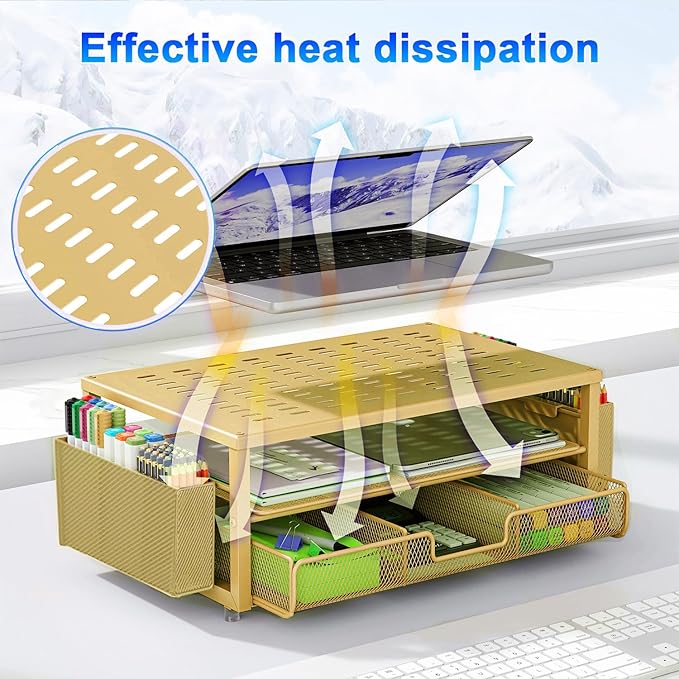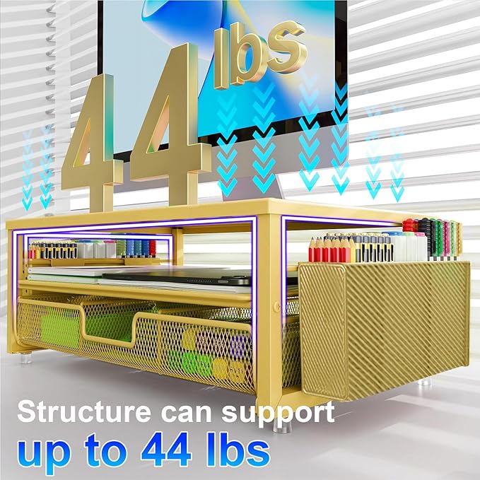 - 【Unique Desk Decor】: The monitor stand has a classic gold coating, adding elegance and modernity to your office while being sturdy and practical. allowing you to work in a cozy and tidy environment with greater comfort and efficiency.