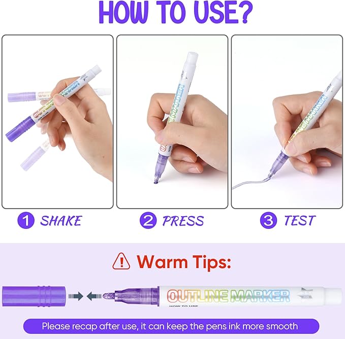 - 🎨Markers :Double line outline glitter pens is Great for making color letters for added fun for drawing and drawing.The outline markers Multiple colors can be suitable for greeting cards, graffiti, poster making, Hand copy.outline markers brings endless joy to your life